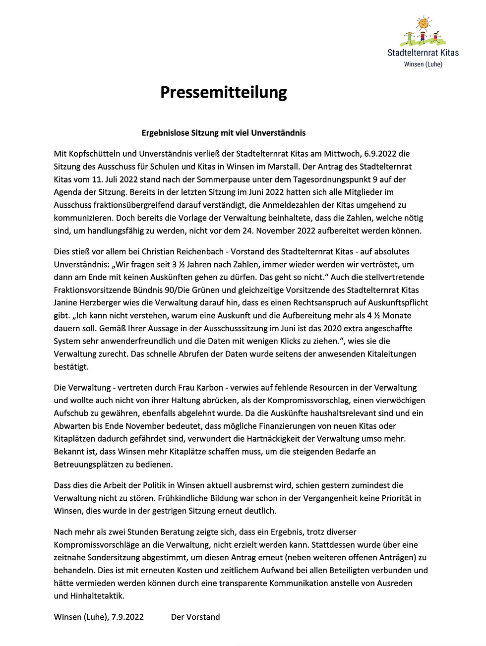 Pressemitteilung KitazahlenSep 17, 20221 min readAm 6.9.2022 tagte der Ausschuss für Schulen und Kitas in Winsen. Auf der Tagesordnung standen 2 Anträge zur Offenlegung der Kitazahlen. Leider ohne Ergebnis.